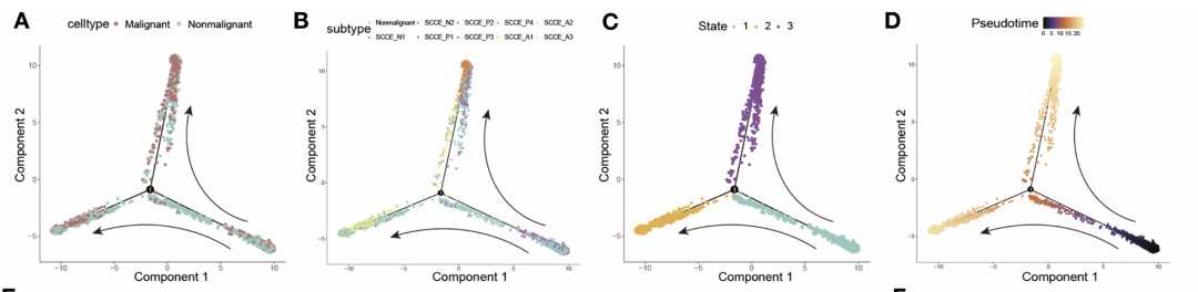 SCCE_P细胞集中在根部,表明该亚型可能代表一个共同的祖细胞样群体。相比之下,SCCE_N细胞和SCCE_A细胞占据不同的末端分支,对应于不同的分化轨迹。