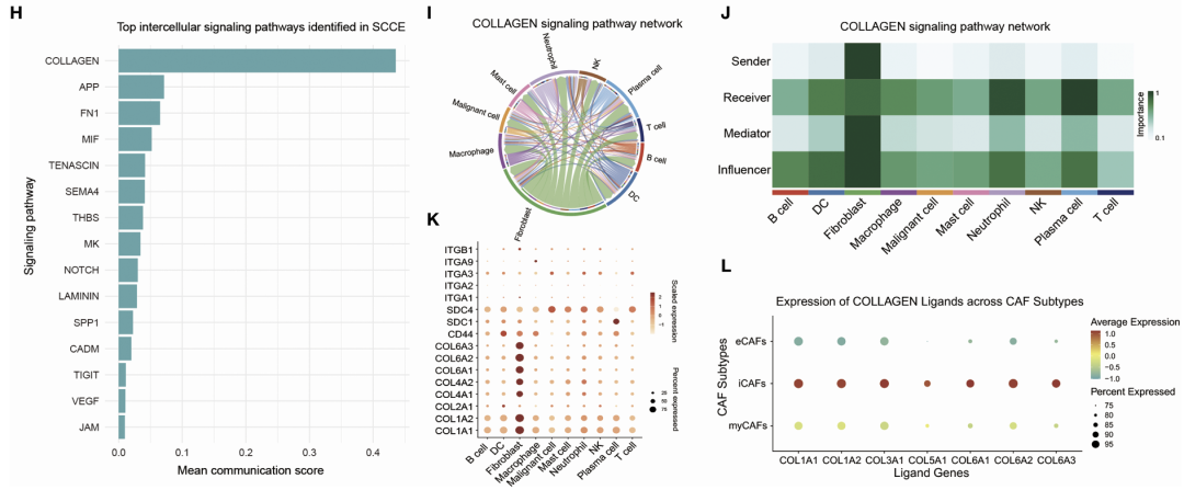 胶原信号级联是SCCE中最突出的细胞间通讯轴,其次是APP,FN1和MIF信号传导。iCAFs可能是参与胶原蛋白介导的细胞间信号传导的细胞外基质成分的主要来源。