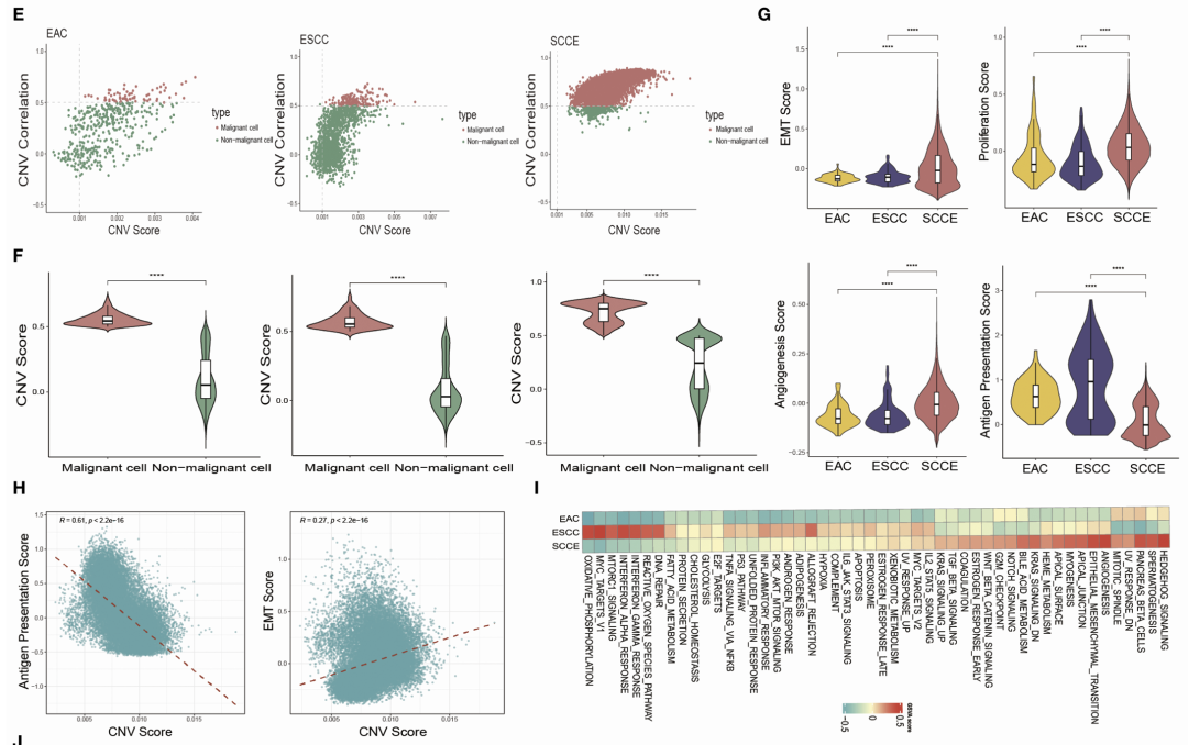 恶性和非恶性上皮细胞之间存在明显的分离。表现出高CNV负荷和与高CNV参考亚群的强相关性的细胞被归类为恶性,恶性细胞表现出明显高于非恶性细胞的CNV评分。SCCE细胞在上皮间充质转化、增殖和血管生成方面表现出显著更高的评分。SCCE中的抗原呈递评分显著降低,表明抗原呈递能力受损。SCCE内CNV评分与EMT呈正相关,但与抗原呈递能力呈负相关。