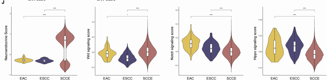 为了进一步验证SCCE的神经内分泌并研究相关调控途径,使用典型NE标记物(包括ASCL1、NEUROD1、NKX2-1、INSM1、CHGA、CHGB、NCAM1和SYP)计算了 NE 特征评分。与EAC和ESCC相比,SCCE表现出显著升高的NE评分,强化了其独特的小细胞样表型。评估与NE分化和肿瘤进展密切相关的信号通路Wnt、Notch和Hippo通路的活性。