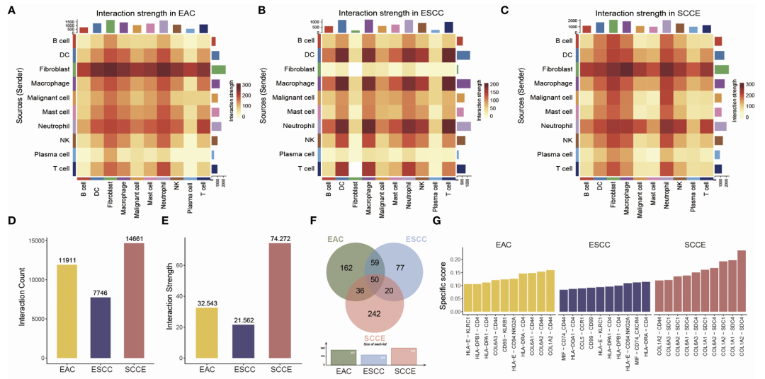 EAC和ESCC表现出相对集中的相互作用模式,而SCCE显示出更广泛和均匀分布的细胞间信号传导。从定量上看,SCCE在三组中表现出最多的相互作用数量和最大的累积相互作用强度。配体-受体对的比较分析表明,SCCE表现出最多的总相互作用。SCCE富集的相互作用主要涉及COL6A/COL1A配体和SDC1/SDC4受体的多种组合,表明该亚型中具有不同的配体-受体特征。