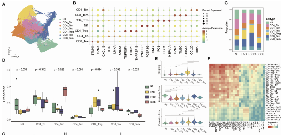 CD4_Trm细胞在SCCE中显著富集,而CD4_Treg细胞和CD8_Tem细胞相对减少。CD4_Treg细胞表现出升高的调节评分,NK细胞表现出增强的细胞毒性活性,CD8_Tex细胞表现出明显的耗竭。对28个常用研究的免疫检查点基因的表达谱显示,SCCE中存在广泛的下调,大多数检查点配体和受体在几乎所有T/NK亚群中均以低水平表达。