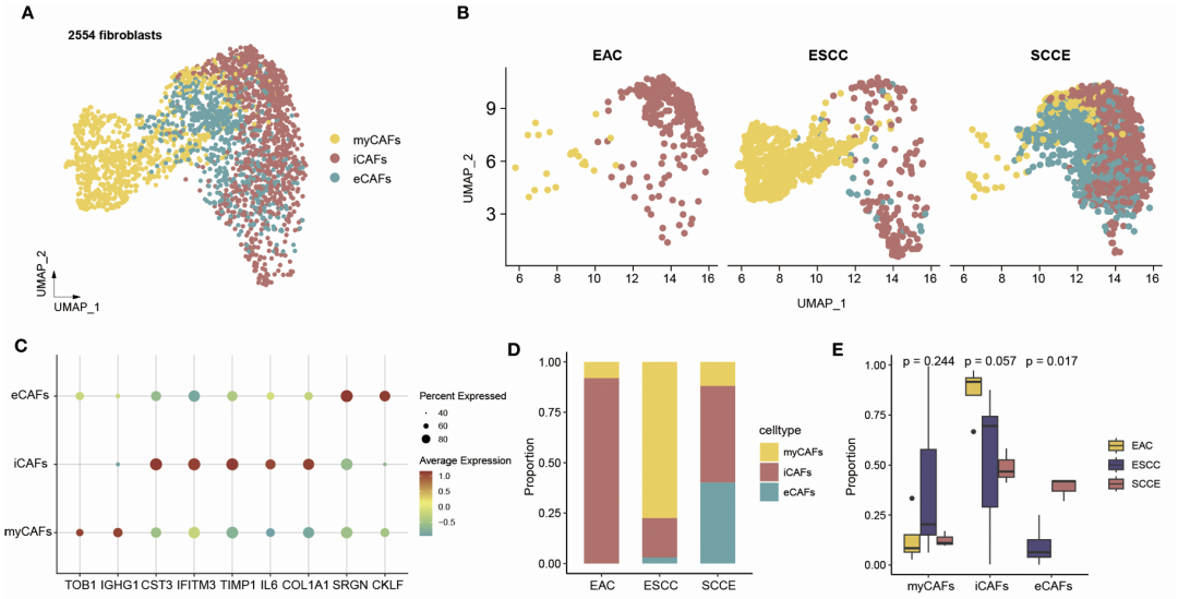 无监督聚类确定了三种不同的成纤维细胞亚型,即肌成纤维细胞CAF(myCAF)、炎症CAF(iCAF)和细胞外基质CAF(eCAF)。eCAF在EAC中不存在,在ESCC中几乎检测不到,但在SCCE中显著富集。iCAF存在于所有三组中,在EAC中比例最高,而myCAF在ESCC中占主导地位。eCAF在SCCE中成纤维细胞的比例显著更高,突出了疾病特异性扩展。