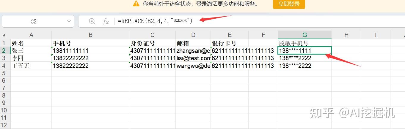 B2:需要脱敏的原始手机号所在单元格。4:第二个参数,表示从第 4 个字符开始替换。4:第三个参数,表示替换的字符长度。"****":第四个参数,表示用什么来替换这 4 个字符。Enter 键,G2 单元格就会显示为 138****1234。