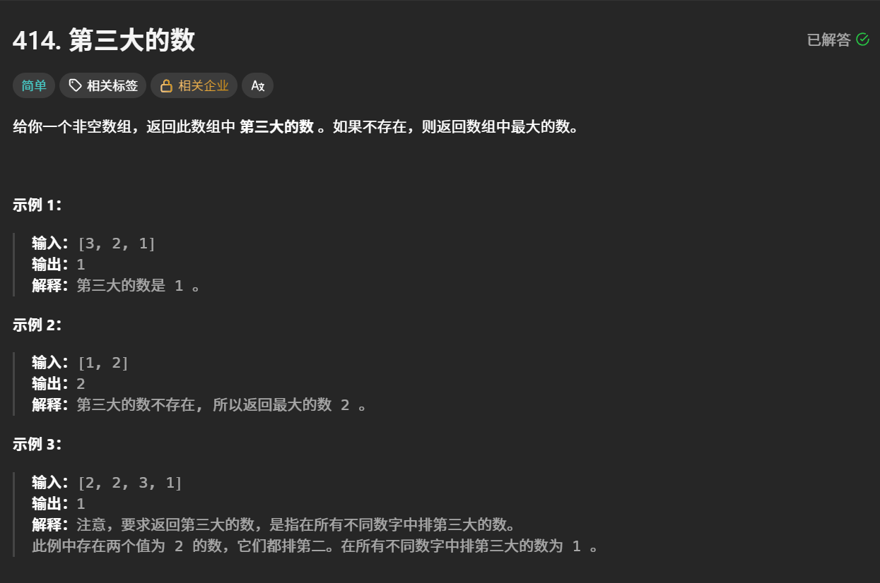 给你一个非空数组,返回此数组中第三大的数,若不存在,则返回数组中最大的数