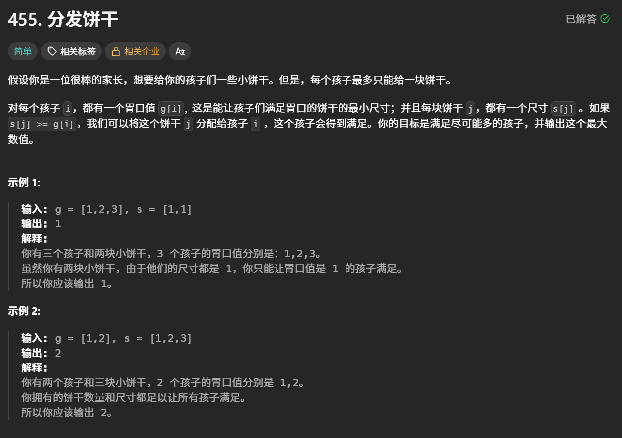 一个孩子只能分到一块饼干,每个孩子都有一个胃口值,当你的饼干尺寸达到孩子的胃口值,孩子才满足,目标是尽可能让多的孩子满足