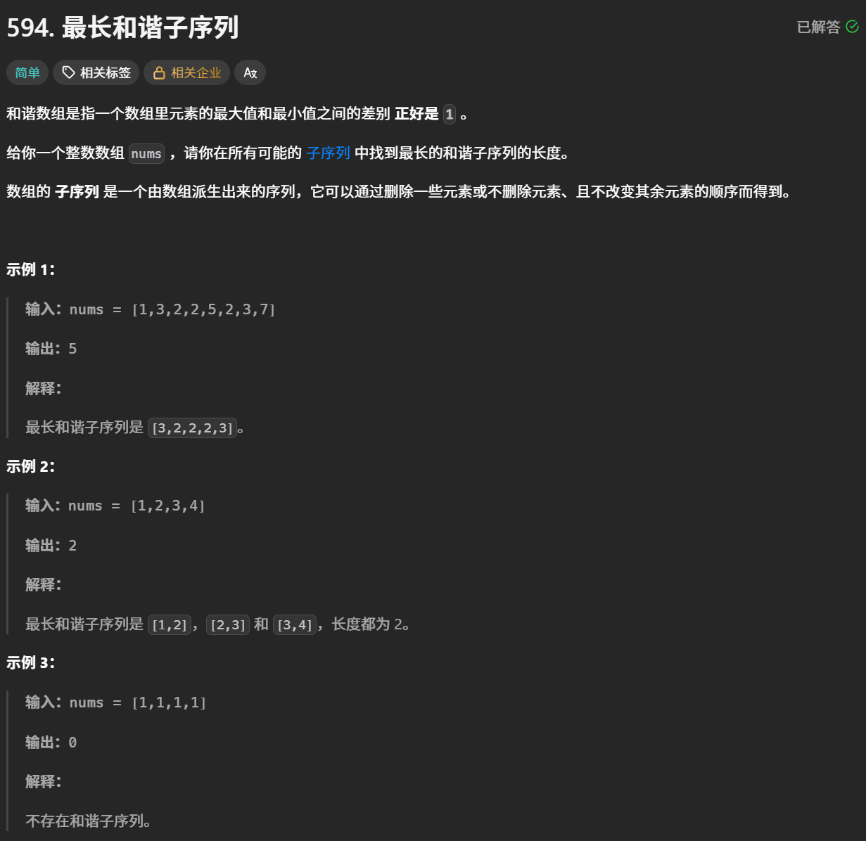 排序:我们只需要依次找到相邻两个连续相同元素的子序列,检查该这两个子序列的元素的之差是否为 1 双指针滑窗: begin 指向第一个连续相同元素的子序列的第一个元素,end 指向相邻的第二个连续相同元素的子序列的末尾元素,如果满足二者的元素之差为 1,则当前的和谐子序列的长度即为两个子序列的长度之和,等于end−begin+1。 循环:初始定义一个ret来计算长度,这里用到一个函数fmax(x,y)函数,来计算x和y的最大值,当循环结束返回的就是长度的最大值