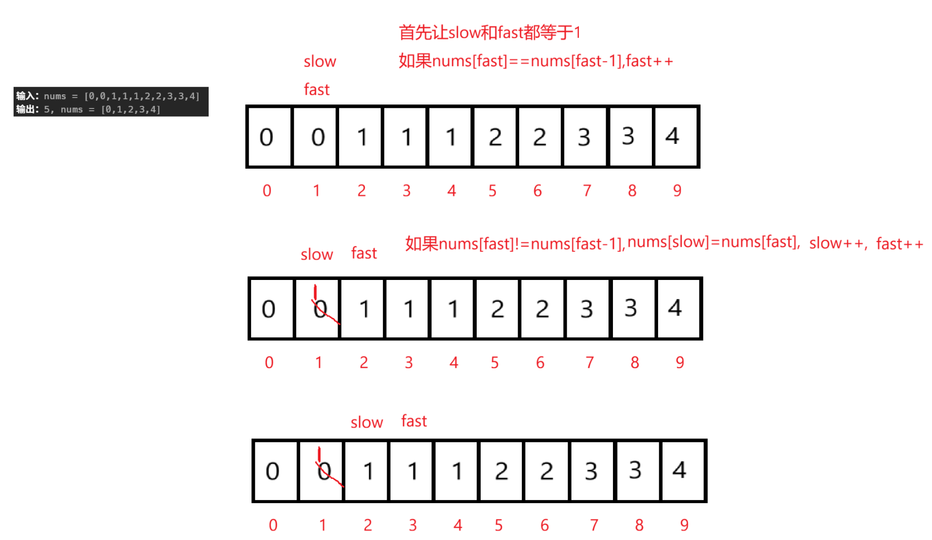 首先定义两个数组的下标fast和slow,初始时slow=fast=1,题中要求删除重复的元素,我们的大概思路就是fast往后走,如果遇到slow位置处不同的数字,就让nums[fast]赋值给nums[slow],然后slow++,fast也++,如果fast往后走的过程中遇到的数字与slow位置处的数字相同,那么就让fast继续往后走,也就是fast++,最后fast走到numsSize为止,此时slow的位置就是要求的不唯一数组的个数