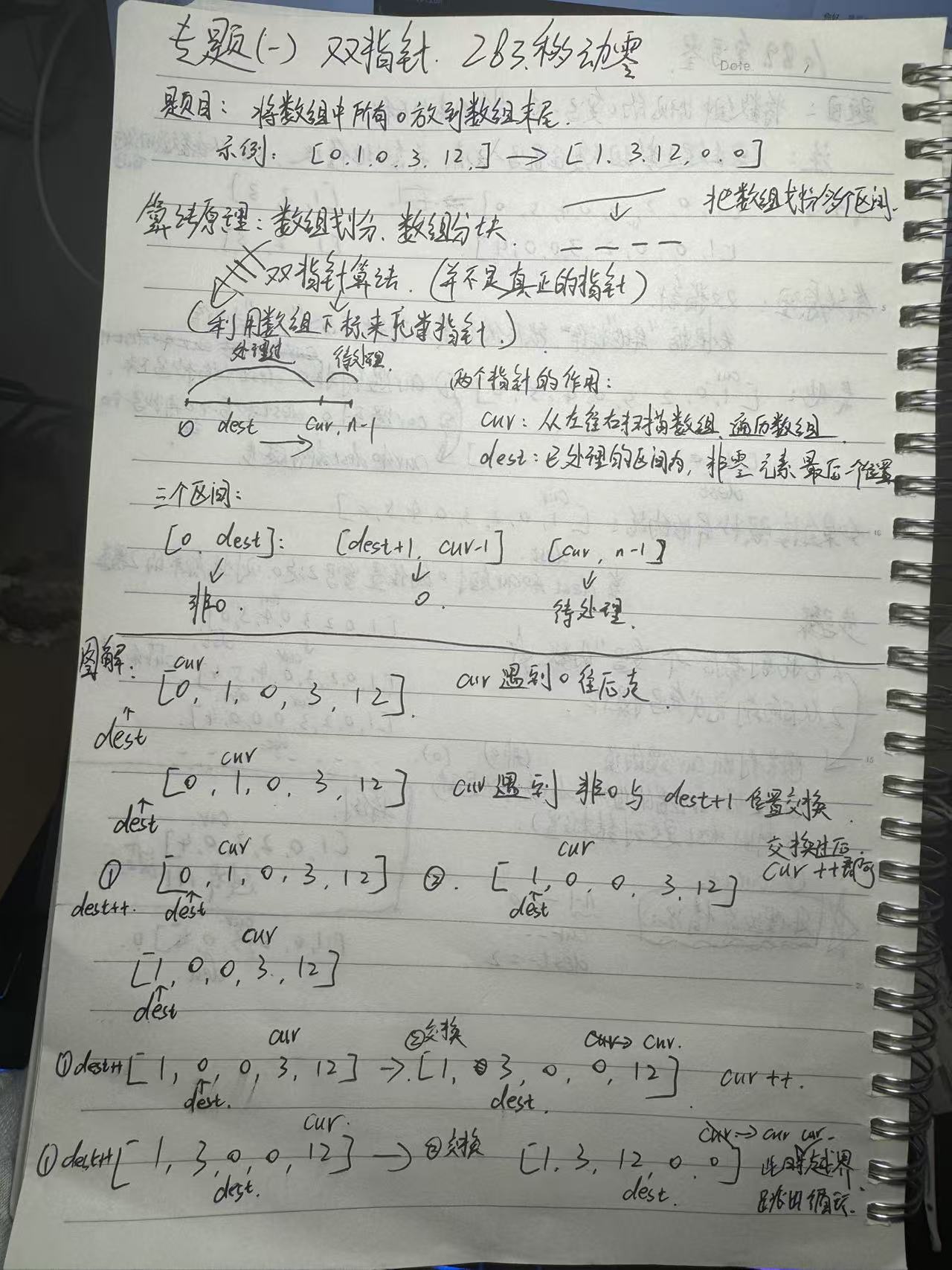 1.初始化 cur=0(用来遍历数组),dest=-1(指向非零元素序列的最后一个位置。因为刚开始我们不知道最后一个非零元素在什么位置,因此初始化为 -1)