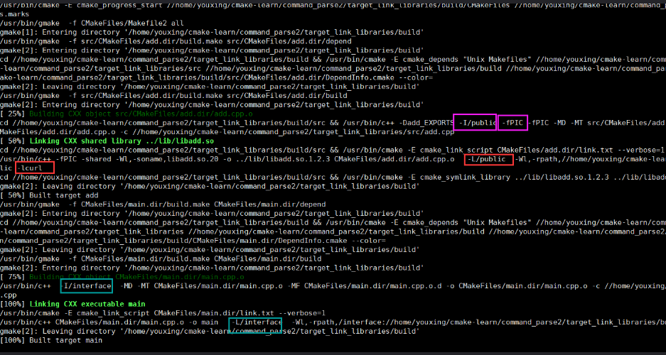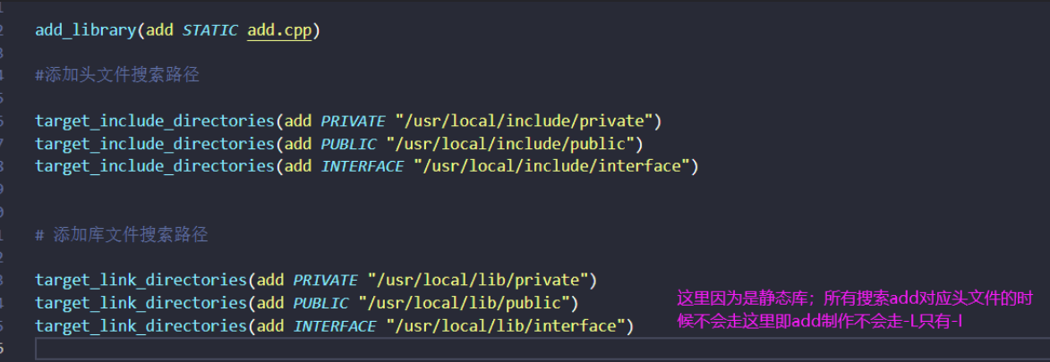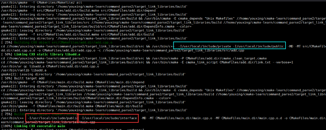 PRIVATE+PUBLIC的),也就是 - I;又因为是静态库故链接库文件搜索路径就没有去。PUBLIC+INTERFACE);再次去搜索头文件和库文件(因为这里是属性传递;只要是符合这俩要求都传递;故库文件路径也去搜索了),也就是 -I -L。因此总结下: