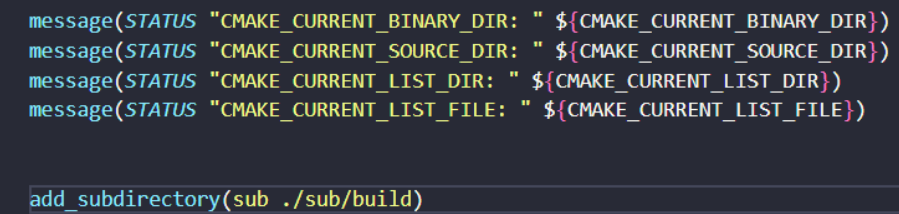 CMAKE_CURRENT_SOURCE_DIR -> 指向子目录的源路径CMAKE_CURRENT_BINARY_DIR -> 指向子目录的构建输出路径CMAKE_CURRENT_LIST_FILE -> 指向子目录的 CMakeLists.txt 文件CMAKE_CURRENT_LIST_DIR -> 指向子目录的 CMakeLists.txt 所在目录source_dir 的路径解析基准是当前 CMakeLists.txt 文件所在的目录。binary_dir 的路径解析基准是当前的构建目录。为了获得相对于正在执行的 CMake 脚本文件的路径,建议统一使用 CMAKE_CURRENT_LIST_DIR 作为参考基准,这在 add_subdirectory 和 include 命令中均适用。