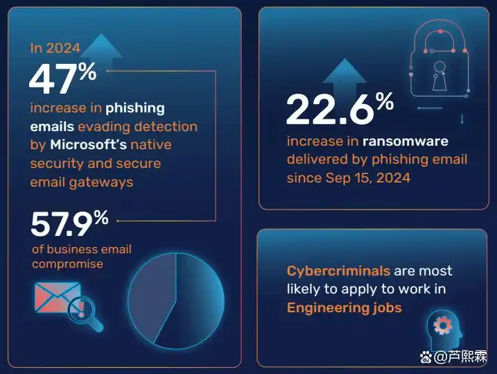 此外,钓鱼攻击已深度嵌入供应链环节。报告显示,11.4%的钓鱼邮件源自受信任的供应链伙伴账户。这意味着攻击者不再局限于直接攻击目标,而是通过渗透其合作伙伴的邮件系统,以“合法身份”发起攻击。这种“跳板式”渗透极大提高了攻击成功率,因为收件方往往对来自合作方的邮件放松警惕。