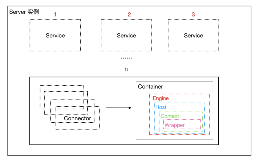 一个Catalina实例(容器) 一个 Server实例(容器) 多个Service实例(容器)