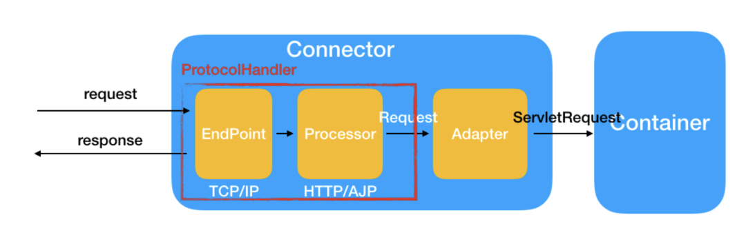 Processor | Processor 是Coyote 协议处理接口 ,如果说EndPoint是用来实现TCP/IP协 议的,那么Processor用来实现HTTP协议,Processor接收来自EndPoint的 Socket,读取字节流解析成Tomcat Request和Response对象,并通过 Adapter将其提交到容器处理,Processor是对应用层协议的抽象。 |
