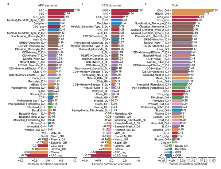 APC和CEG特征活性与Club-like细胞以及髓系和淋巴系免疫细胞呈显著正相关。