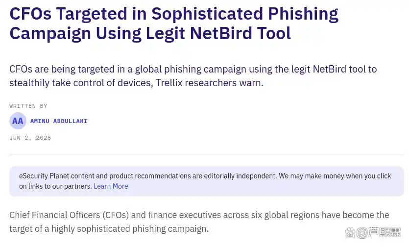 随着企业数字化转型加速,财务部门作为资金流与敏感数据的核心枢纽,其信息系统安全已成为攻击者觊觎的重点。不同于传统广撒网式钓鱼,近年来出现的“鱼叉式钓鱼”(Spear Phishing)呈现出高度定制化、目标精准化和攻击隐蔽性强的特点。尤其值得注意的是,2024年下半年以来,多个网络安全机构报告了一种专门针对首席财务官及其他财务高管的新型钓鱼活动。该活动不再依赖常见的勒索软件或信息窃取器,而是部署一种名为NetBird的开源网络工具变种作为恶意载荷。