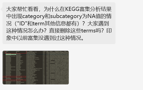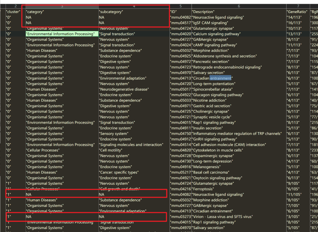 收到我们微信群里一个网友的提问,她使用 Y叔的 clusterProfiler包做KEGG Pathway的富集分析,发现结果的通路分级中含有NA值,如下图。 那为什么KEGG富集通路结果中的分类有NA呢?