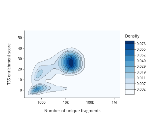 snap.pp.filter_cells(data, min_counts=5000, min_tsse=10, max_counts=100000)