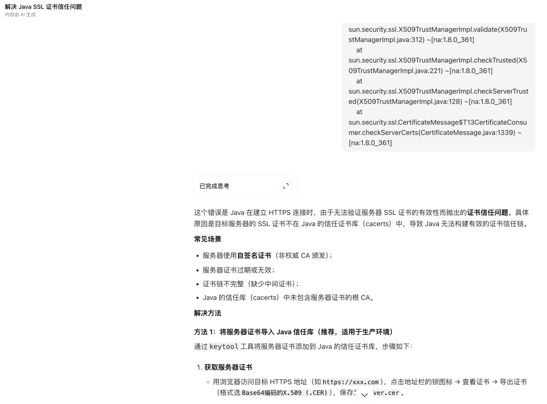 方法 1:将服务器证书导入 Java 信任库(推荐,适用于生产环境)