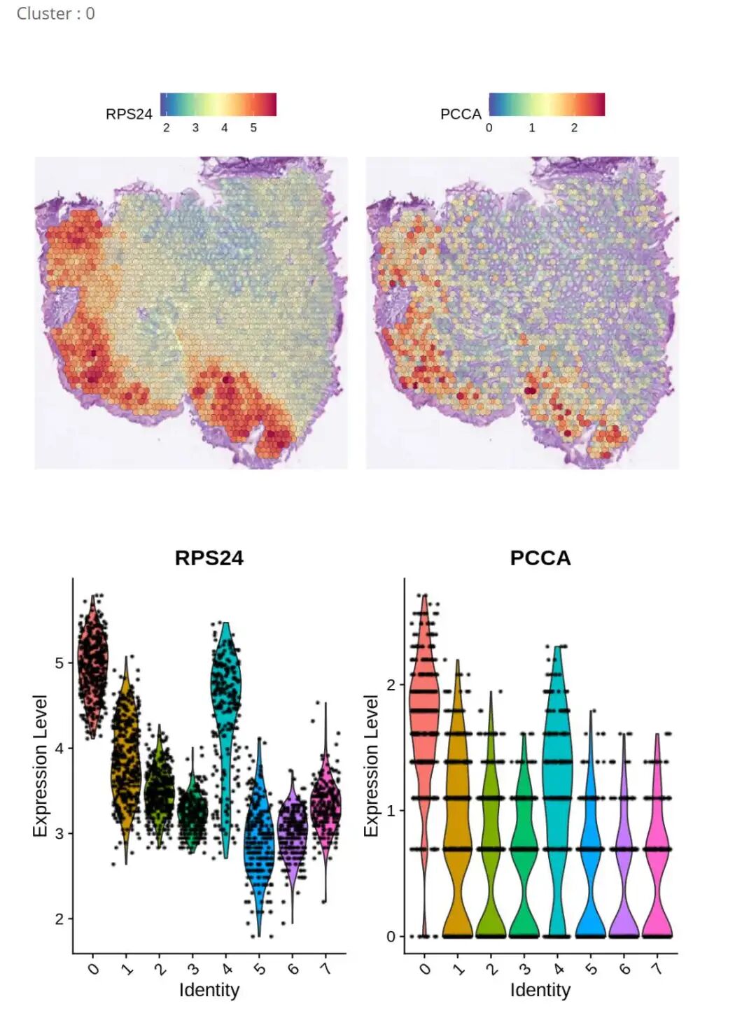 cat( "**Spatial and Violin plots showing the expression of the markers of different clusters ** \n\n")