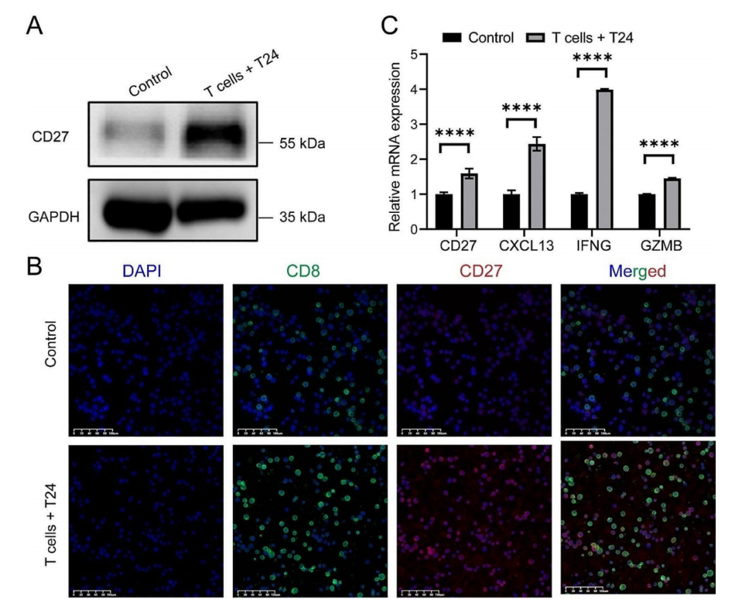 蛋白质印迹(Western blot)和免疫荧光实验表明:枢纽基因CD27在这些肿瘤特异性T细胞中表达上调(图11A-B)。
