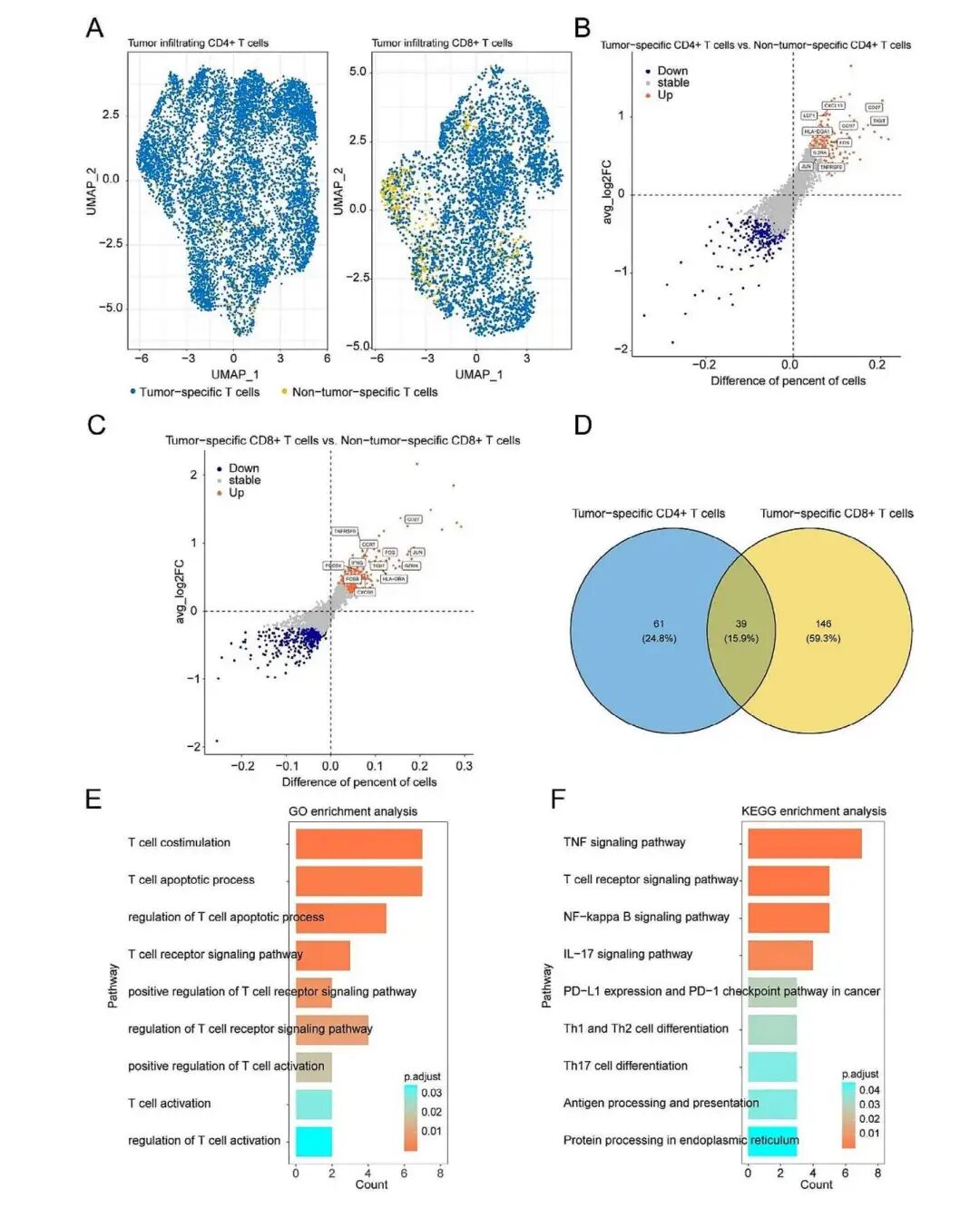(D) 韦恩图展示浸润性 CD4 + T cells 与浸润性 CD8 + T cells 中肿瘤特异性T细胞的上调基因。