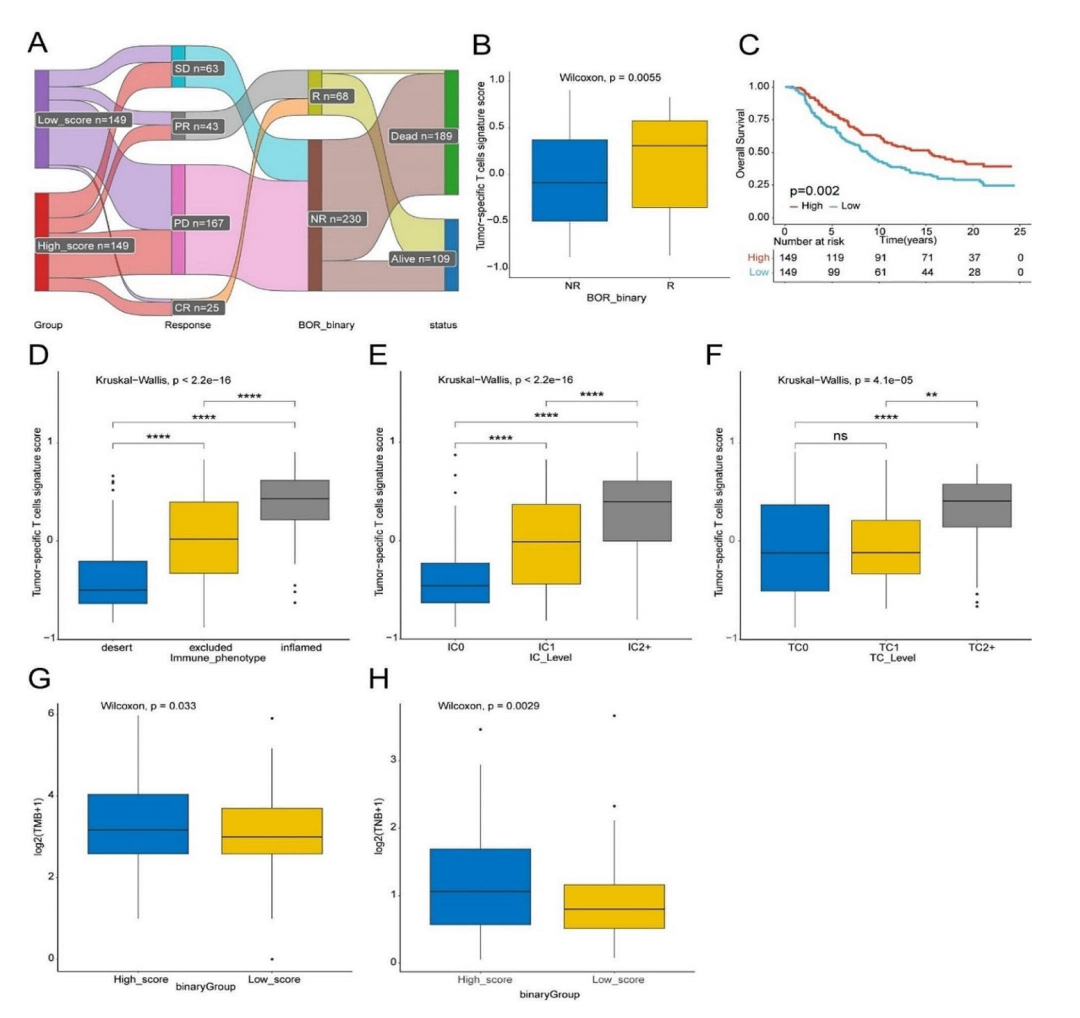 分析另外两个免疫治疗队列,包括一个膀胱癌队列和一个黑色素瘤队列。在这两个队列中,较高的TstcSig评分均与更好的免疫治疗临床应答和更佳的临床结局相关(图6A-H)。这些结果强化了TstcSig与免疫治疗反应之间的关联。