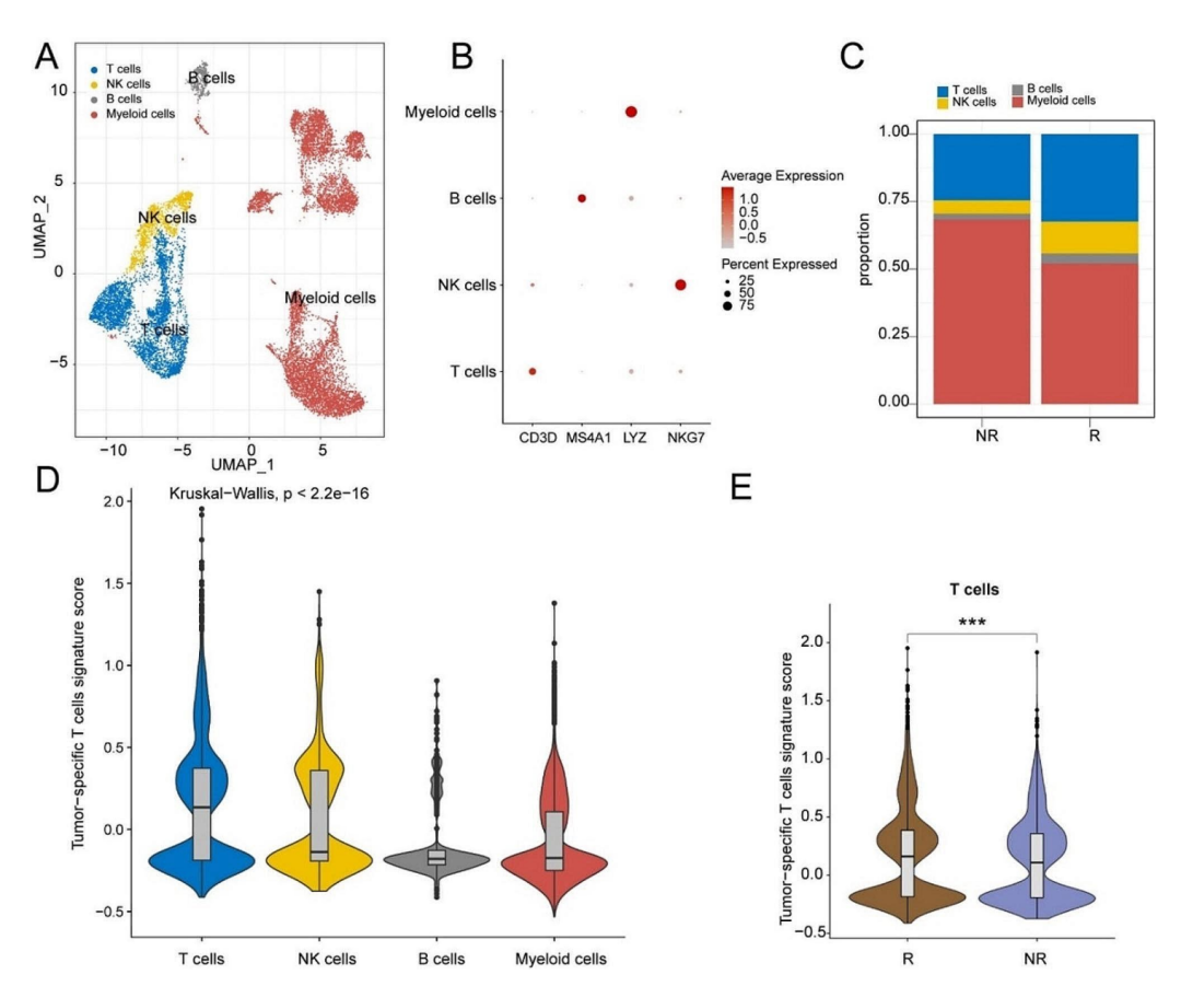 (D) 小提琴图显示T细胞、NK细胞、B细胞和髓系细胞簇的TstcSig评分分布。