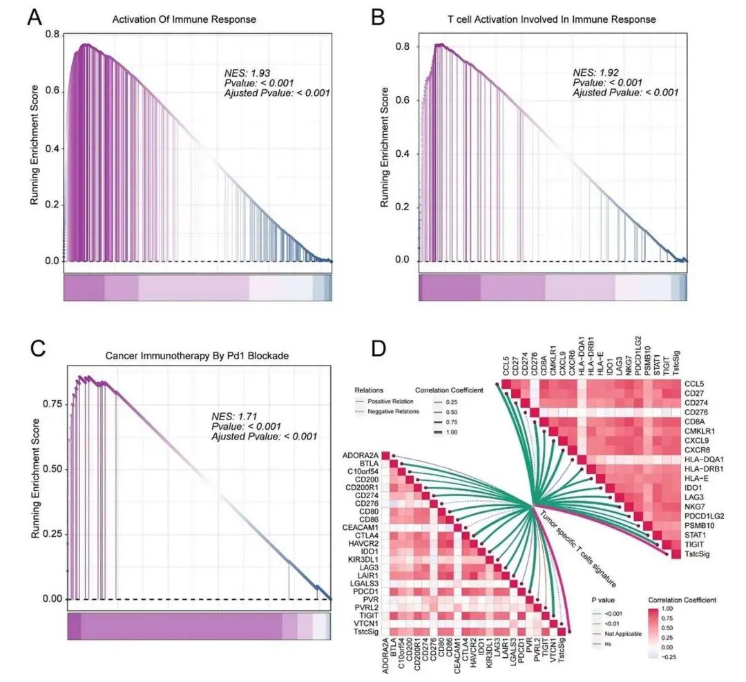 在高TstcSig组中,包括免疫应答的激活、免疫应答中的T细胞活化以及PD1阻断癌症免疫治疗在内的免疫反应相关通路均显著上调(图4A-C)。