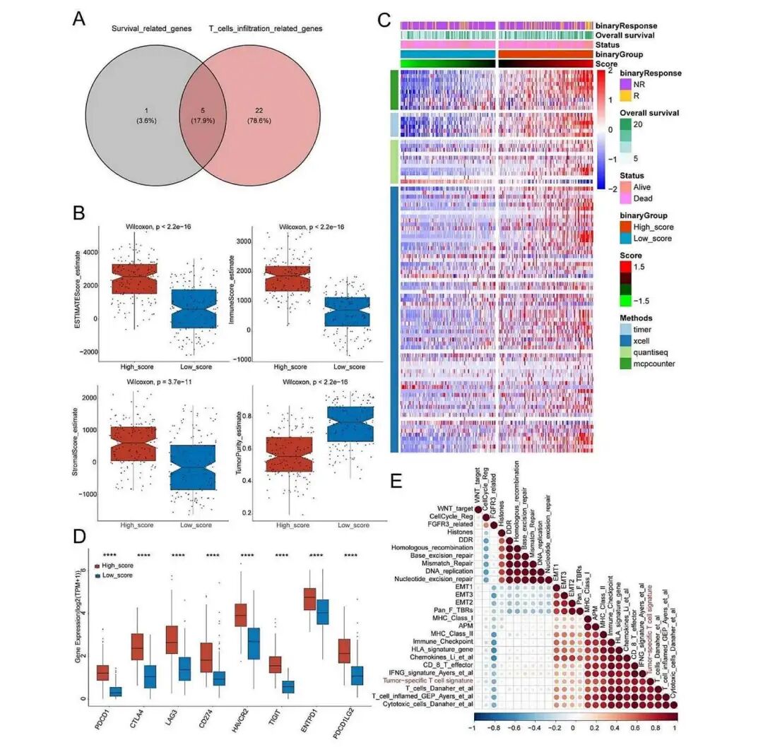 A) 韦恩图展示与免疫治疗患者预后及T细胞浸润相关的5个枢纽基因。