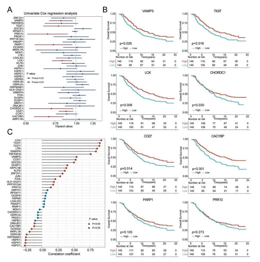 (A) 森林图展示单因素Cox回归分析结果。其中Cox回归P值小于0.05的基因为 VAMP5、TIGIT、LCK、CHORDC1、CD27、CACYBP、PARP1和PRR13。