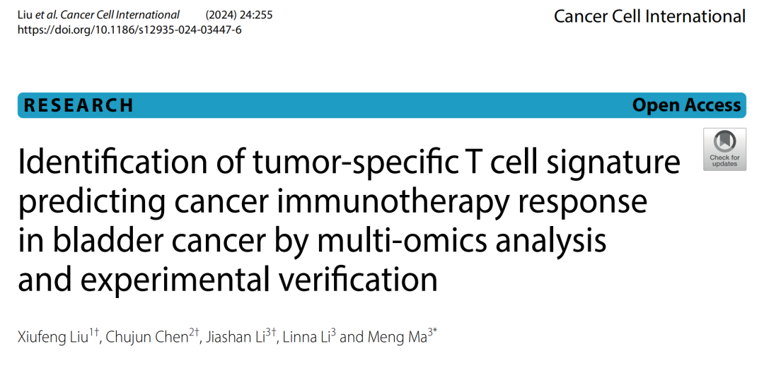 题目:Identification of tumor-specific T cell signature predicting cancer immunotherapy response in bladder cancer by multi-omics analysis and experimental verification 期刊:Cancer Cell International 日期:20 July 2024 DOI:10.1186/s12935-024-03447-6
