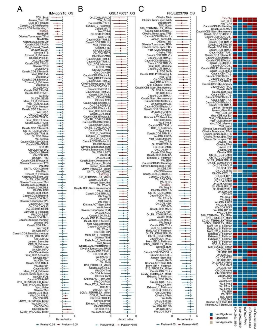 在评估了TstcSig的预测价值后,有必要将其与其他T细胞特征在预测免疫治疗患者预后方面的性能进行比较。我们收集了109种T细胞特征(补充文件1),并在三个免疫治疗队列中针对总生存期进行了单因素Cox回归分析。