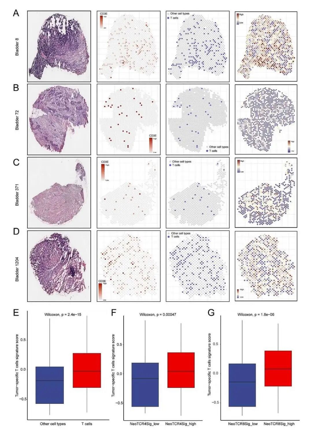分析显示,TstcSig与肿瘤微环境(TME)中的T细胞浸润呈正相关(图9A-D)。T细胞的TstcSig评分显著高于其他细胞类型(图9E)。(F-G) 箱式图分别显示TstcSig评分与NeoTCR4 (F) 和NeoTCR8 (G) 特征评分的相关性。