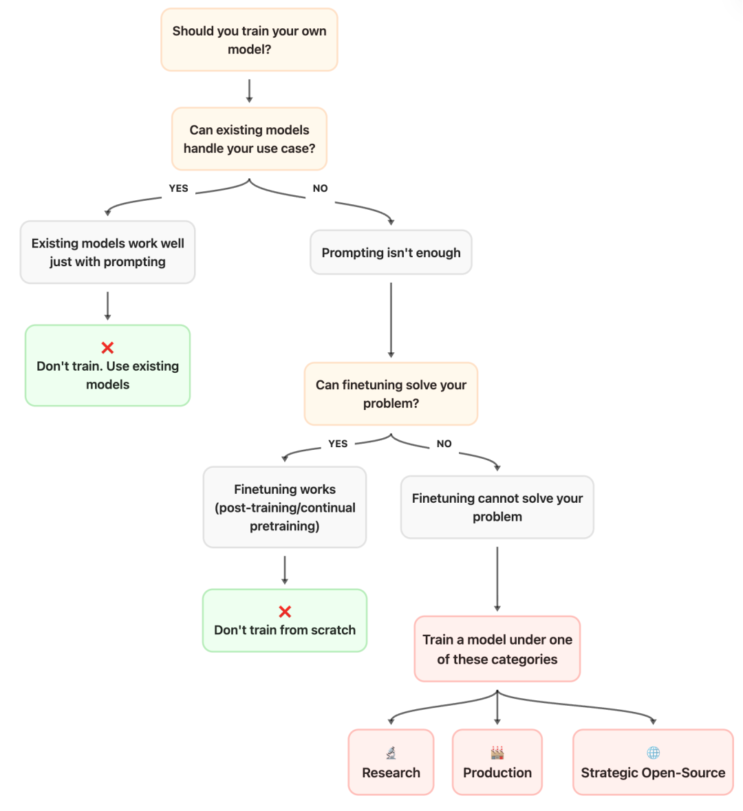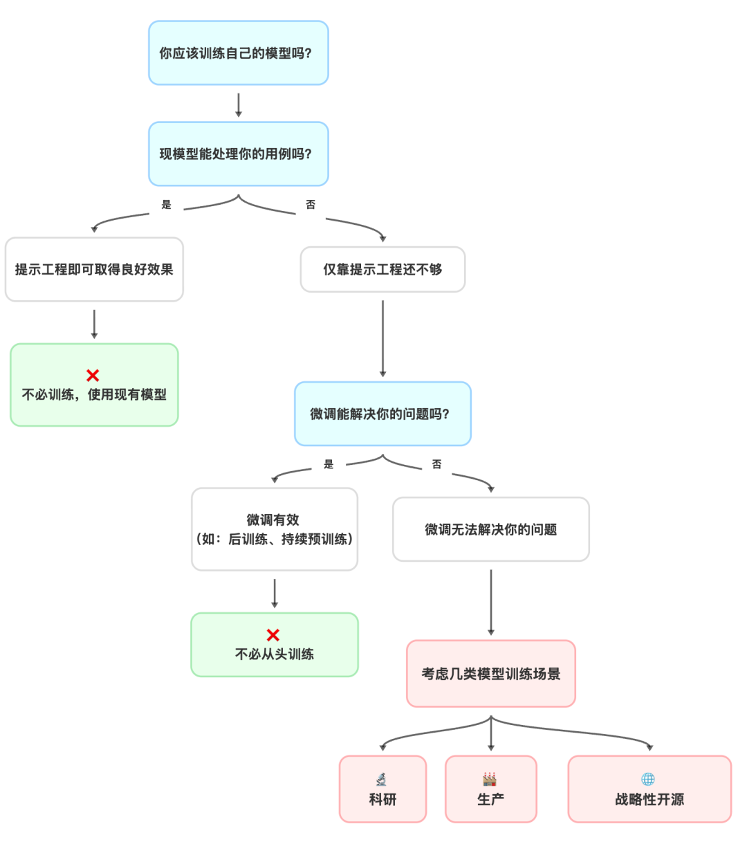 - 一个决策流程图(上图所示): 它会引导你系统性地思考,在投入巨额的计算和时间成本之前,你当前的需求是否真的需要从头训练一个模型。或许,简单的提示工程或微调(Finetuning)就足以解决问题。