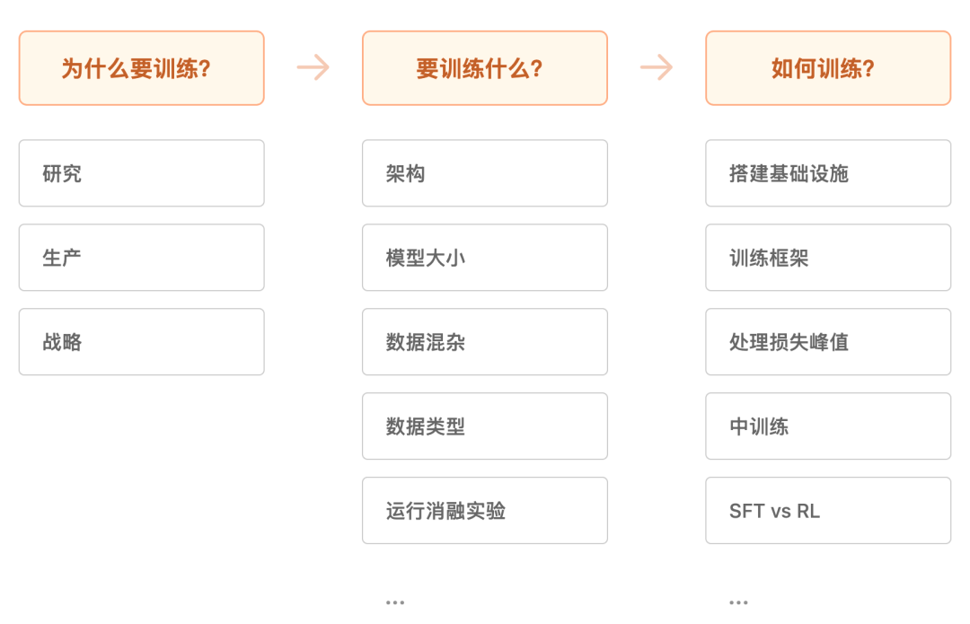 - 训练的三个正当理由: 手册明确指出,从头预训练只适用于三种情况:前沿研究(Research)、特定的生产需求(Production),或是填补战略性的开源空白(Strategic Open-Source)。它会帮你判断你的项目是否属于其中之一。
