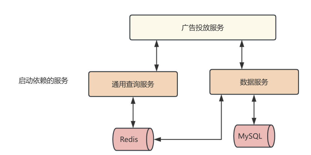 再比如我现在有一个广告投放服务, 其一是依赖于广告数据服务拉取数据并构建倒排索引, 其二是依赖通用数据查询服务拉取算法推数信息构建算法倒排以及正排索引, 而数据查询服务依赖于Redis, 数据服务依赖于Mysql以及Redis, 因为启动都依赖于它们, 由此它们都是属于广告投放服务的静态耦合点, 如果我们要进行拆分, 那么就需要识别到广告数据查询服务以及通用查询服务的存在, 因为它们都是服务启动必需项,如下: