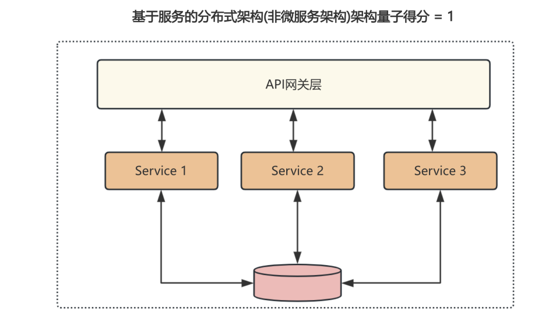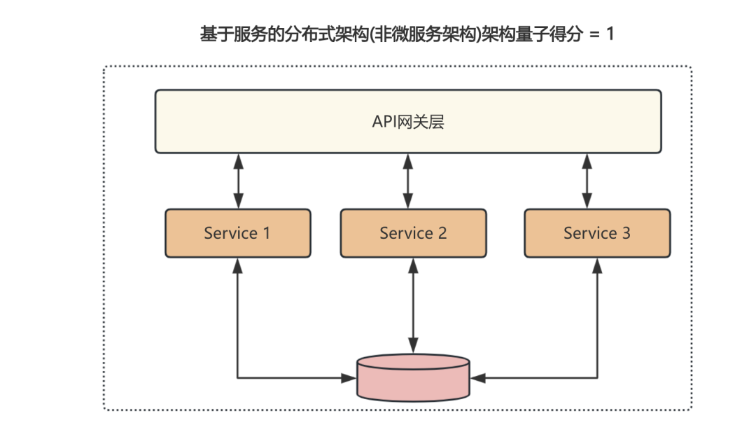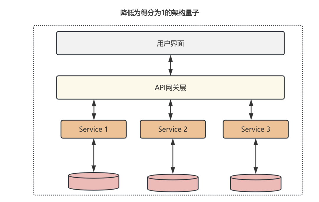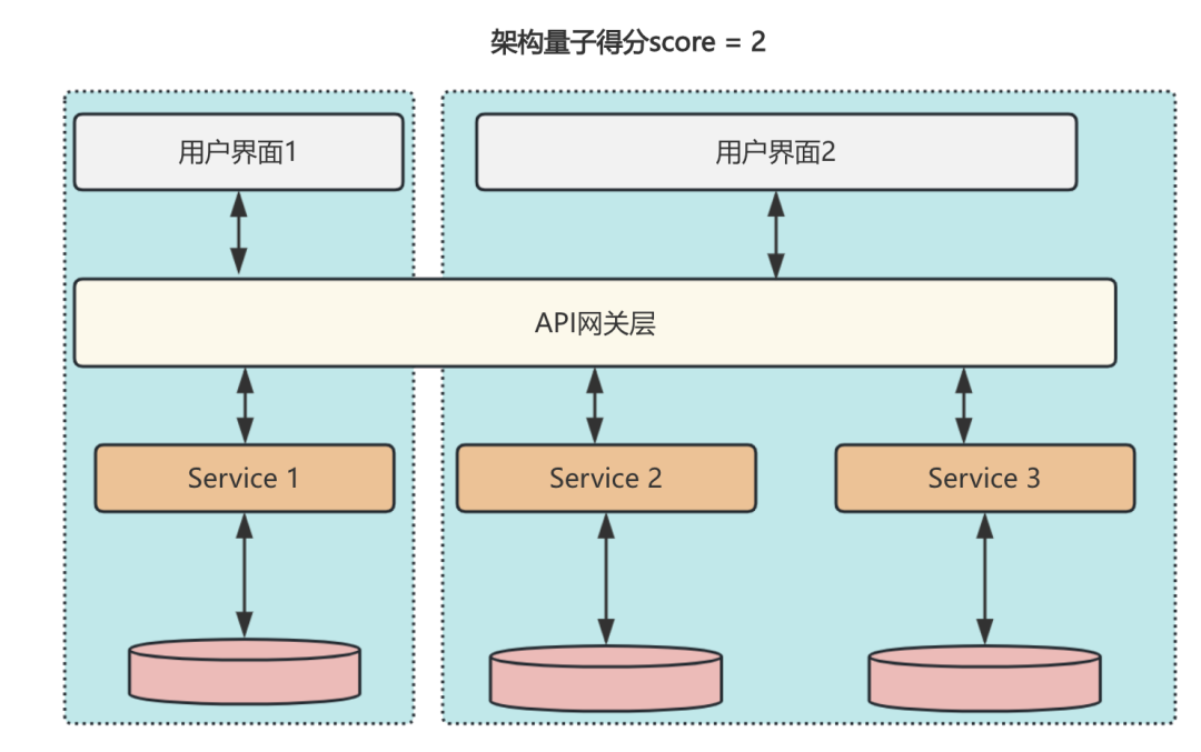 然而如果上述都是用同一个用户界面同步调用, 比如Service1是用户系统、Service2是商品系统、Service3是订单系统, 那么假如进入到一个订单支付页面, 假设页面上既需要展示用户信息, 同时又展示推荐商品, 还有一个订单信息查询, 那么这个用户界面就需要同时分别查询三个service, 如果都聚合在一个API, 相当于一个操作同步调用三个服务, 这个时候由于用户界面的紧密耦合导致我们的架构又降低分数为1的架构量子: