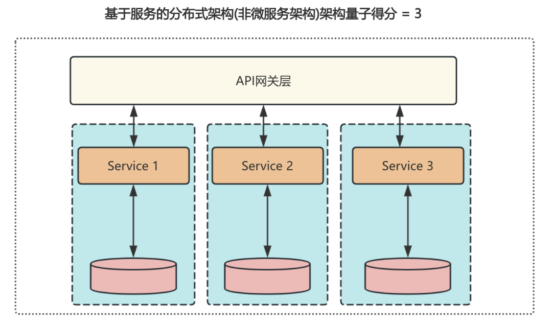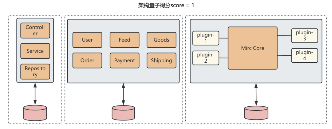 因此如果我们想让上述的架构量子得分为3, 那么相应的service服务都必须要依赖各自独立的数据库耦合点, 由此才能得到3个架构量子, 即: