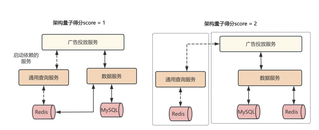 如果我将上述的通用查询服务, 即查算法倒排索引改成异步方式, 也就是非必需方式, 采用运行时拉取, 那么这个时候架构量子的得分是不是就是2呢? 不一定, 因为如果Redis是共用一个集群, 那么仍然得分仍然是1, 如果是两个Redis集群, 那么得分就是2, 即: