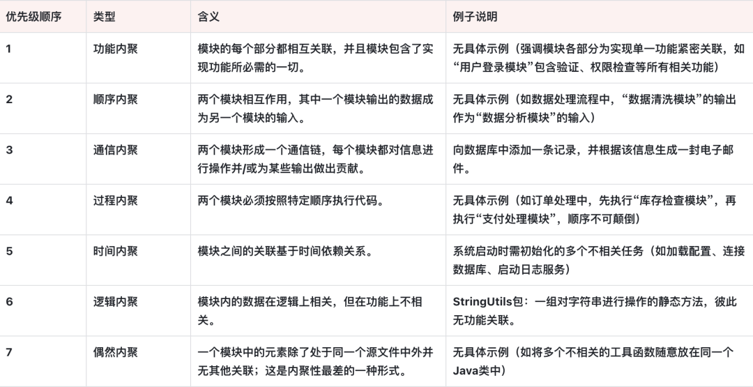 由此可见, 高功能内聚性在结构上意味着架构中的元素, 比如类、组件或者服务等之间的相似性, 计算机科学家定义了一系列内聚性度量标准(按好到坏顺序)如下: