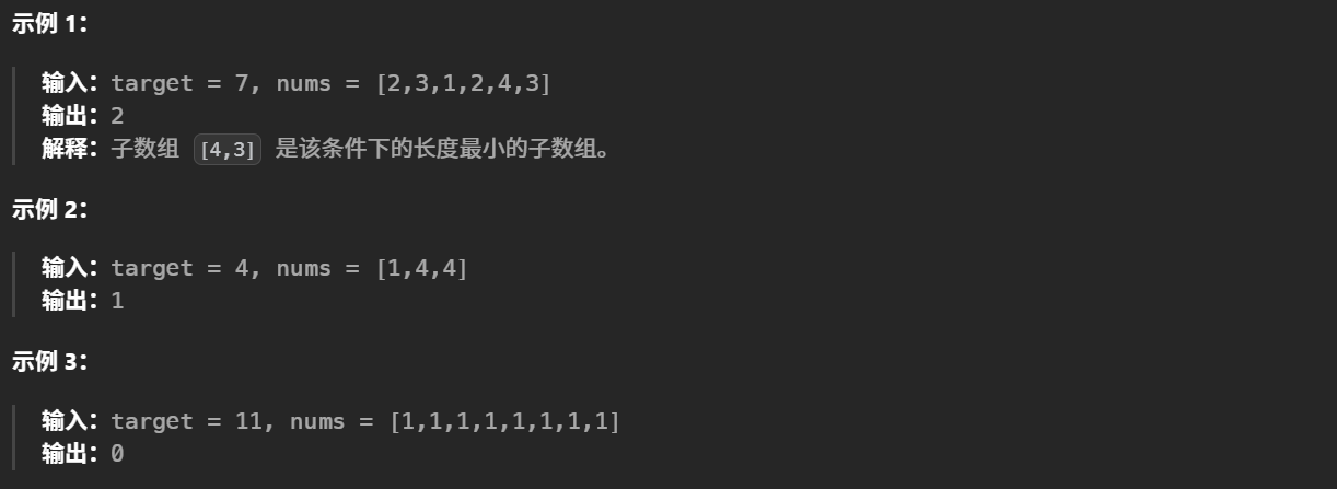 让滑动窗口满足:从 i 位置开始,窗口内所有的和小于 target (那么当窗口内元素之和第一次大于等于目标值的时候,就是 i 位置开始,满足条件的最小长度)