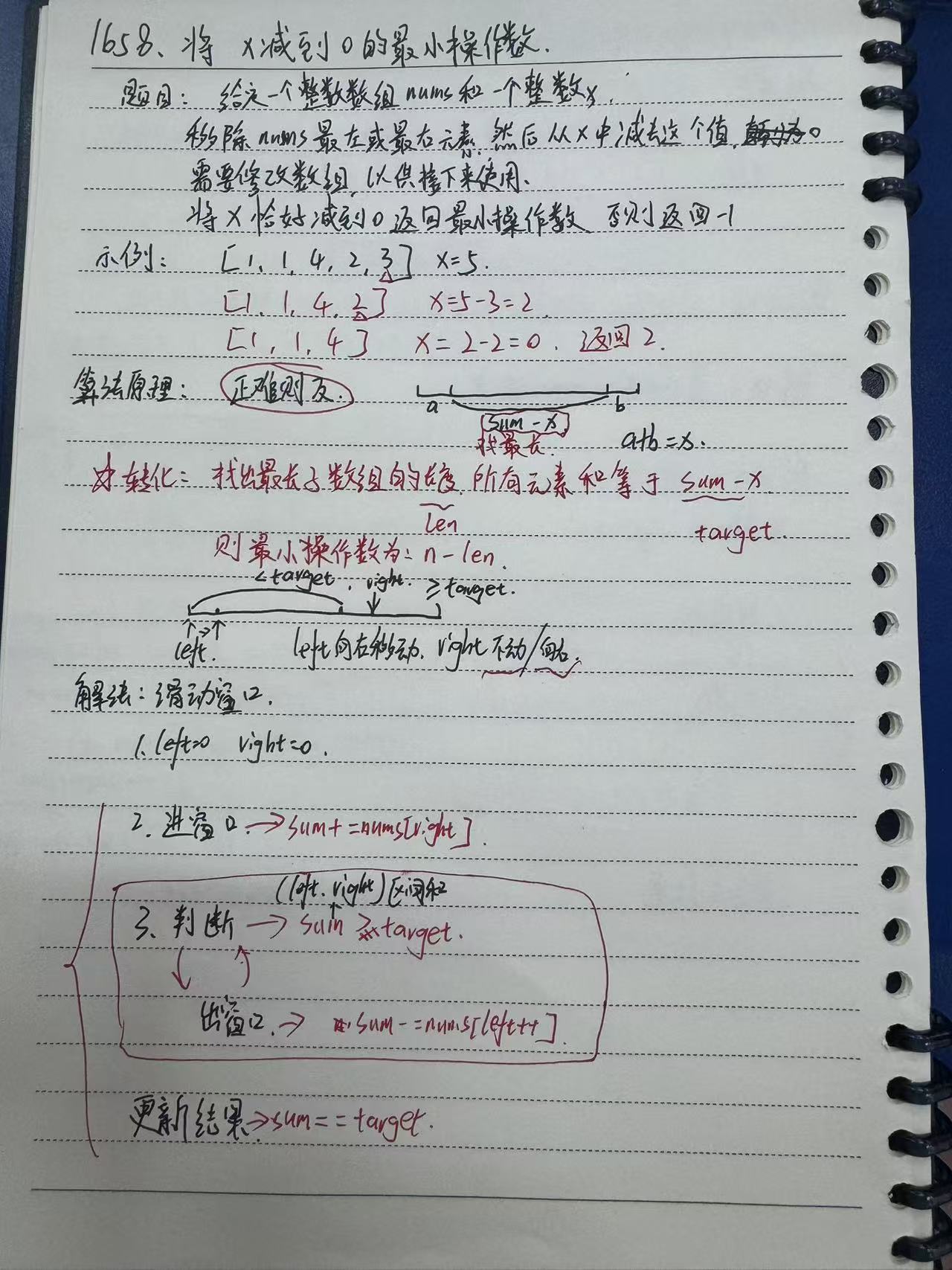 • 转化:要求进行最少次数的减为0的操作数,此时就可以转化为找子数组,是的子数组最长并且子数组之和为target(sum-x)