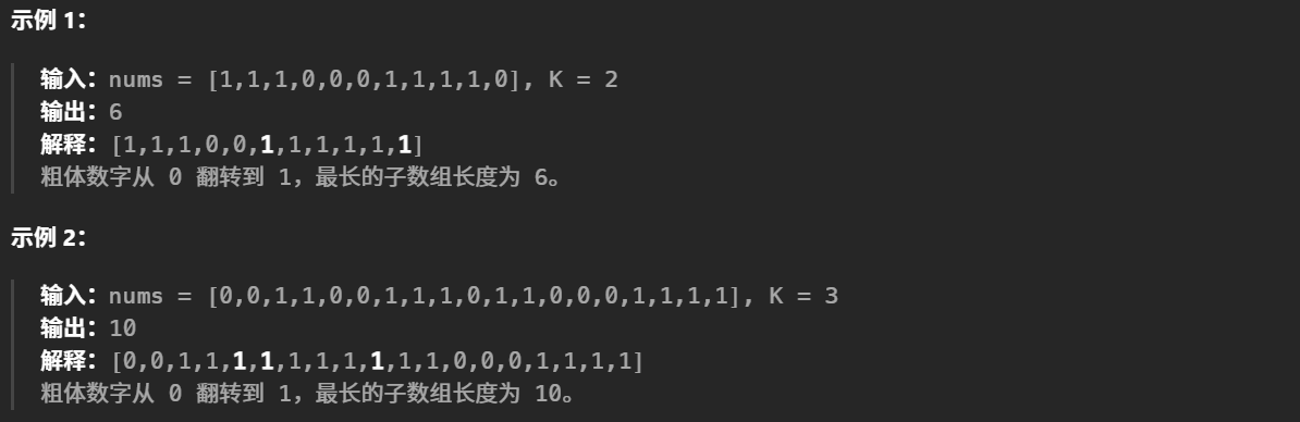 • 我们要做的就是在数组的子数组中寻找0的个数zero<k的最长的那一个子数组