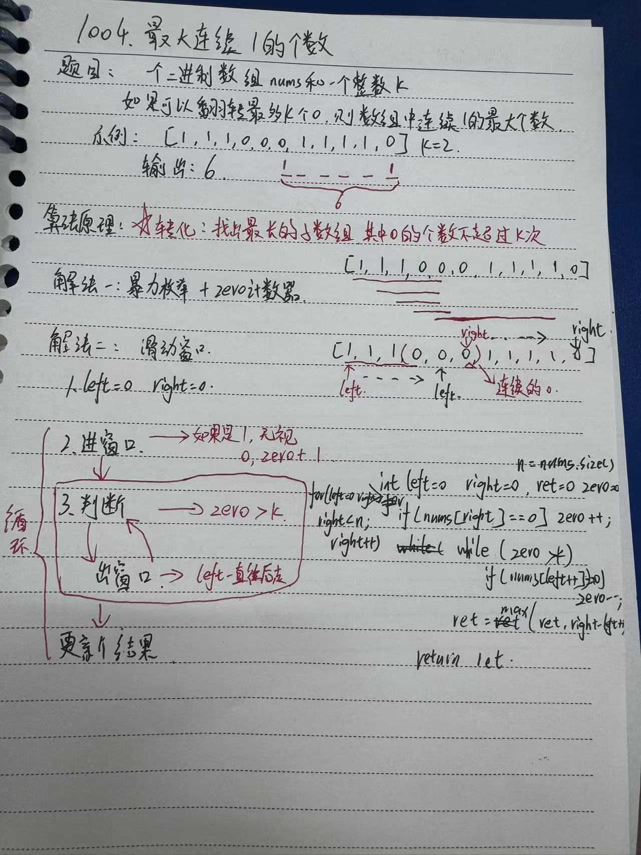 判断zero>k,如果成立,就让nums[left]滑出窗口,并让计数器zero--,直到zero合法为止