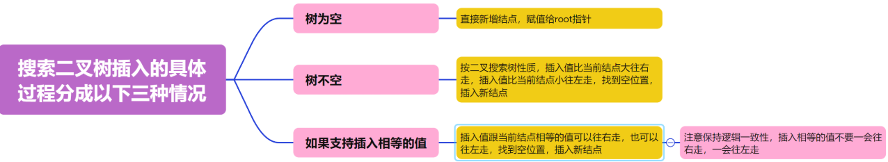 从根节点开始,根据键值大小选择左子树或右子树,直到找到空位置插入新节点。
