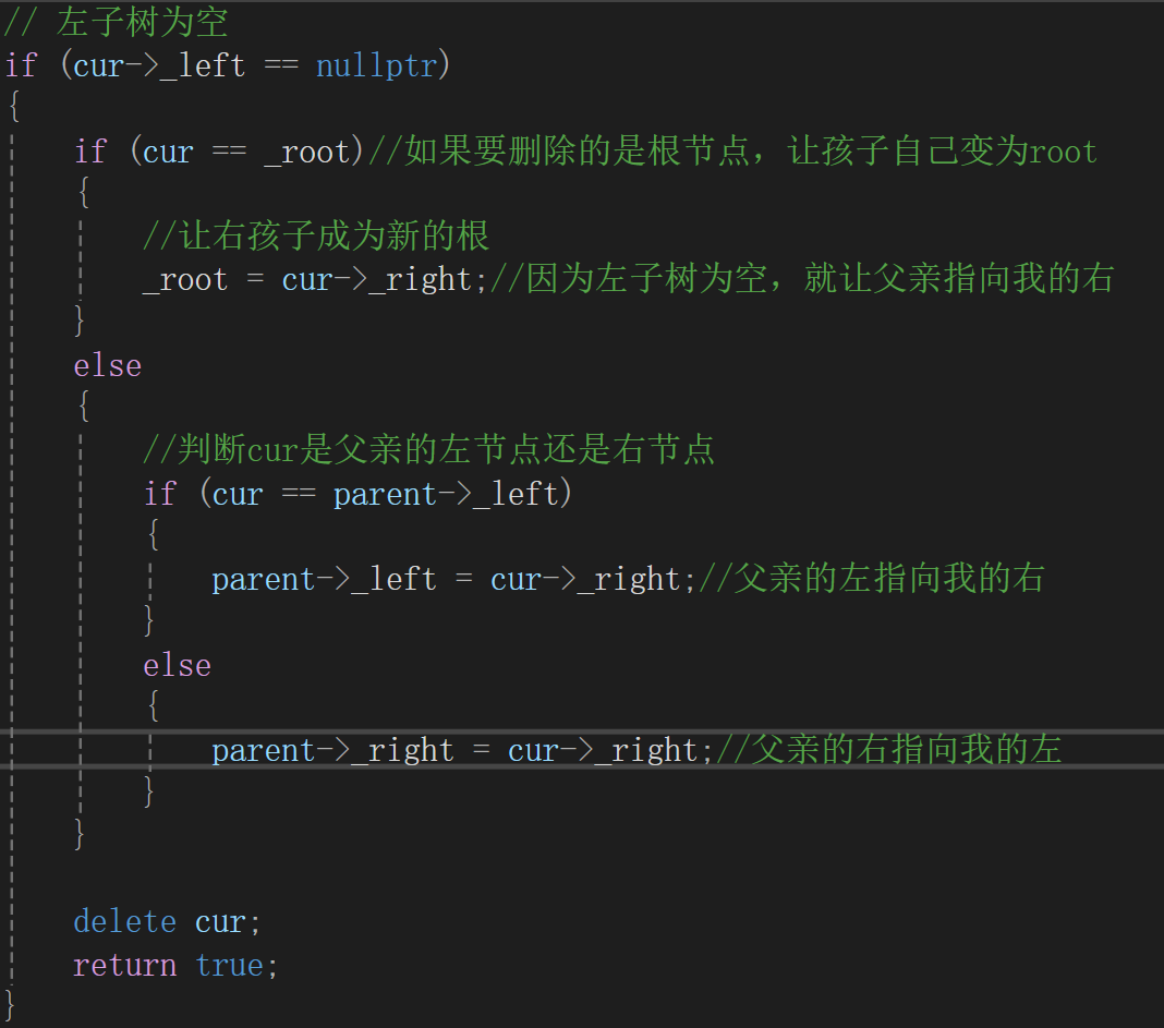 parent->_left = cur->_left; // 父节点的左指针指向cur的左孩子