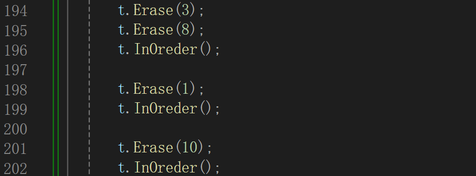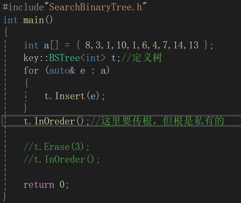 t.InOrder(); // C++递归很麻烦,这里要传根,但是根是私有的