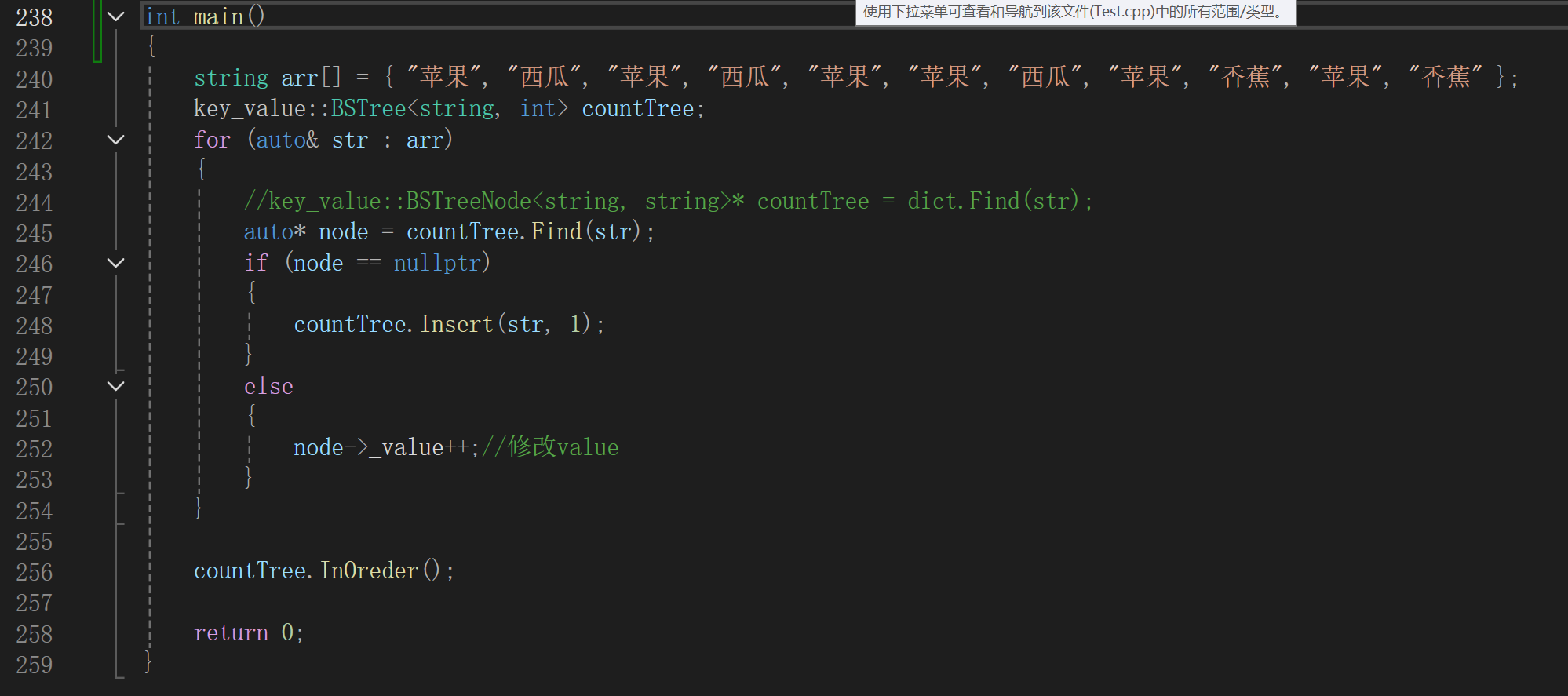 }我们在Test.cpp文件里面包一下头文件,给一个数组,再定义出一棵树,因为数组也是支持范围for的,这里我们用范围for把数据插入进去