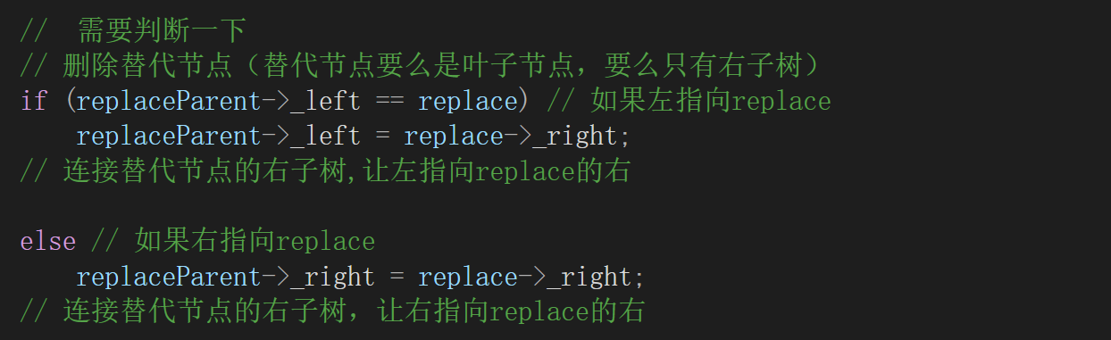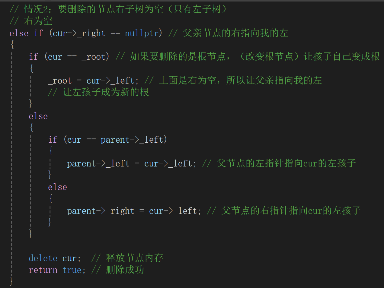 parent->_right = cur->_right; // 父节点的右指针指向cur的右孩子